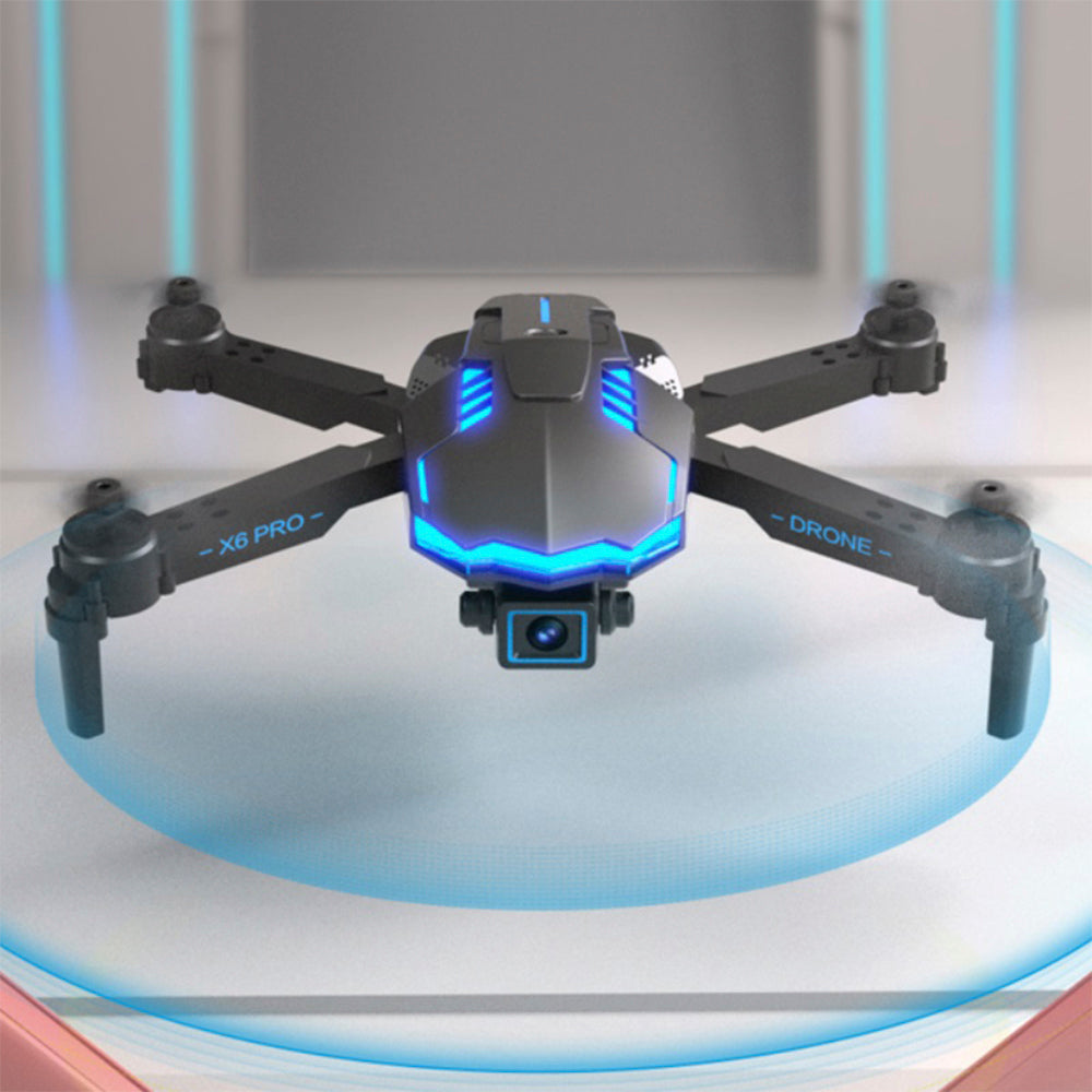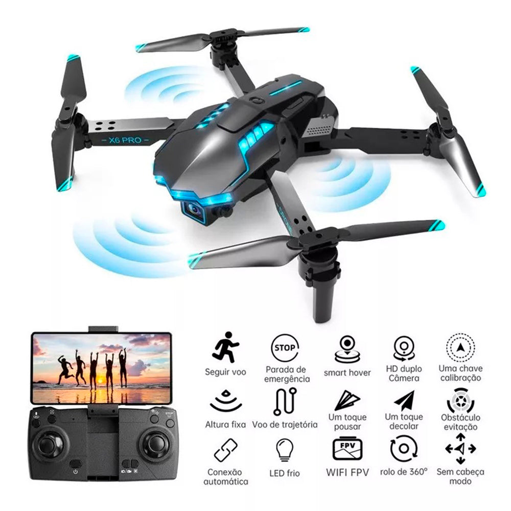 "O Drone X6 abre as portas para aventuras emocionantes, com alcance de 5km, você pode explorar lugares remotos e capturar paisagens espetaculares de ângulos únicos. Suas aventuras se transformarão em memórias inesquecíveis."